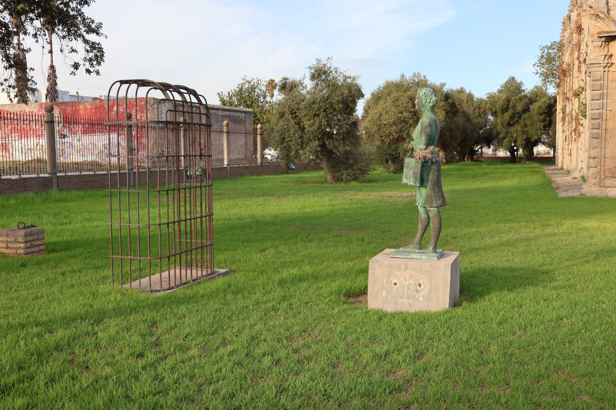 Aquí, en el jardín del Monasterio de la Victoria, en un espacio donde la fe fue cárcel, una mujer mira una reja. No posa. Espera. Resume a tantas mujeres que hicieron colas, llevaron comida y sostuvieron familias mientras sus maridos, hijos o hermanos permanecían dentro del antiguo penal. El conjunto lo creó el escultor portuense Juan Manuel Gallardo y se instaló en mayo de 2002 como homenaje explícito a esas mujeres. La escena la completan unas manos de bronce que asoman entre los barrotes, frente a la figura femenina de tamaño natural. Es un diálogo silencioso entre quien aguarda fuera y quien resiste dentro.