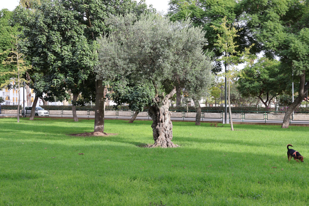 Su diseño apuesta por la claridad. Pradera continua de césped. Caminos de albero que conectan cuatro puertas. Pino piñonero y jacaranda como arbolado dominante, con mediterráneas de acompañamiento —encina, alcornoque, quejigo, olivo y algarrobo— y algunas exóticas bien adaptadas. Un parque pensado para cruzar y para quedarse. Todo figura en la documentación oficial.