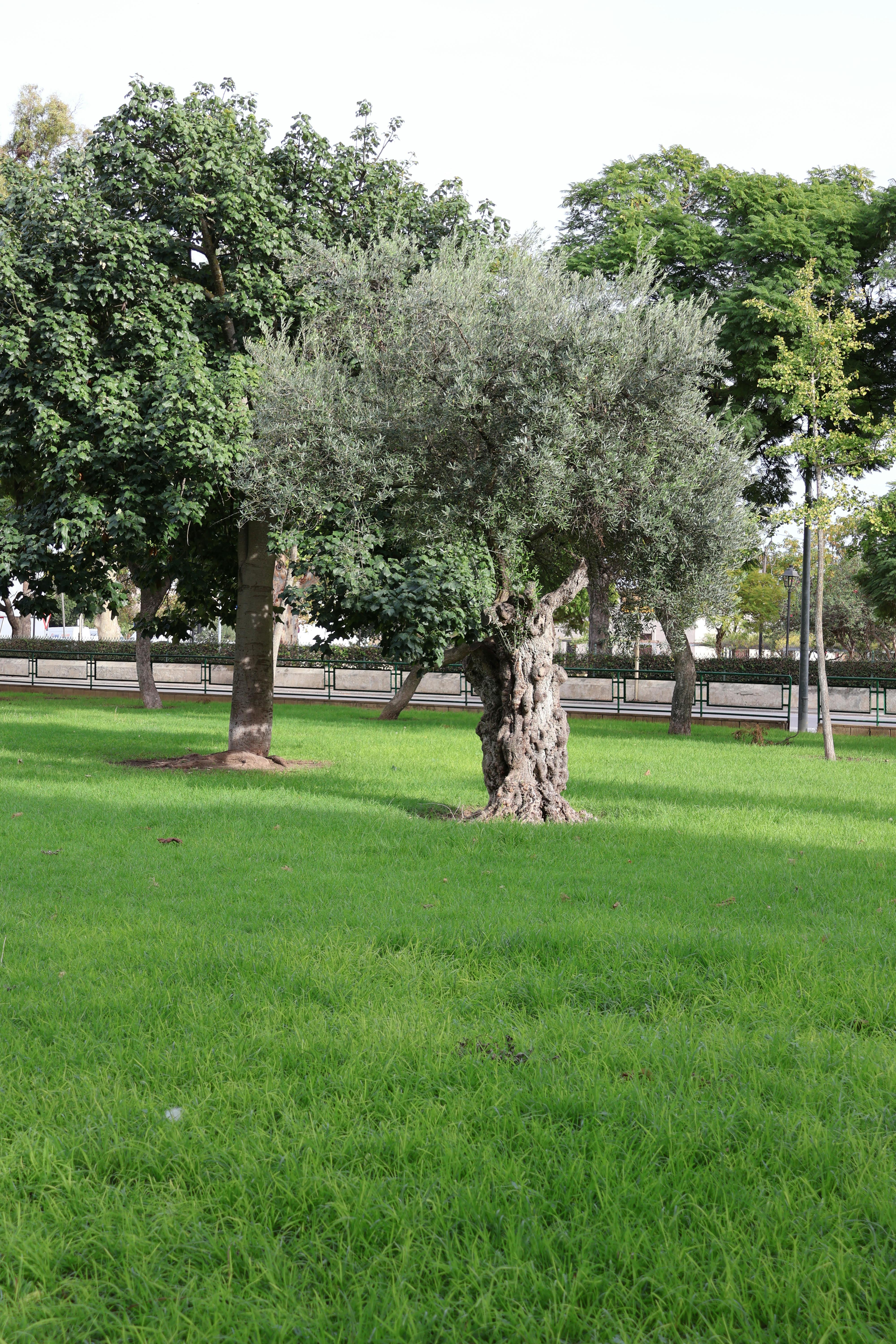 Pino piñonero y jacaranda (dominantes); encina, alcornoque, quejigo, olivo y algarrobo (acompañamiento mediterráneo); metrosidero, ginkgo y palo borracho (exóticas). Diseño de pradera de césped y caminos de albero con cuatro accesos.